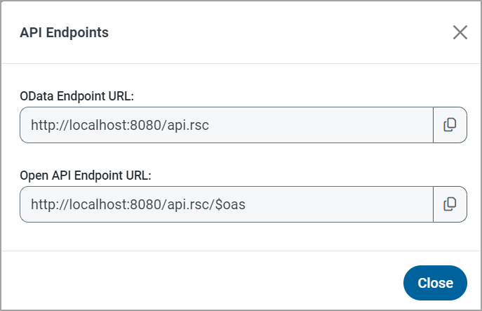 Click View Endpoints on the API page to copy either the OData endpoint URL or the OpenAPI endpoint URL: