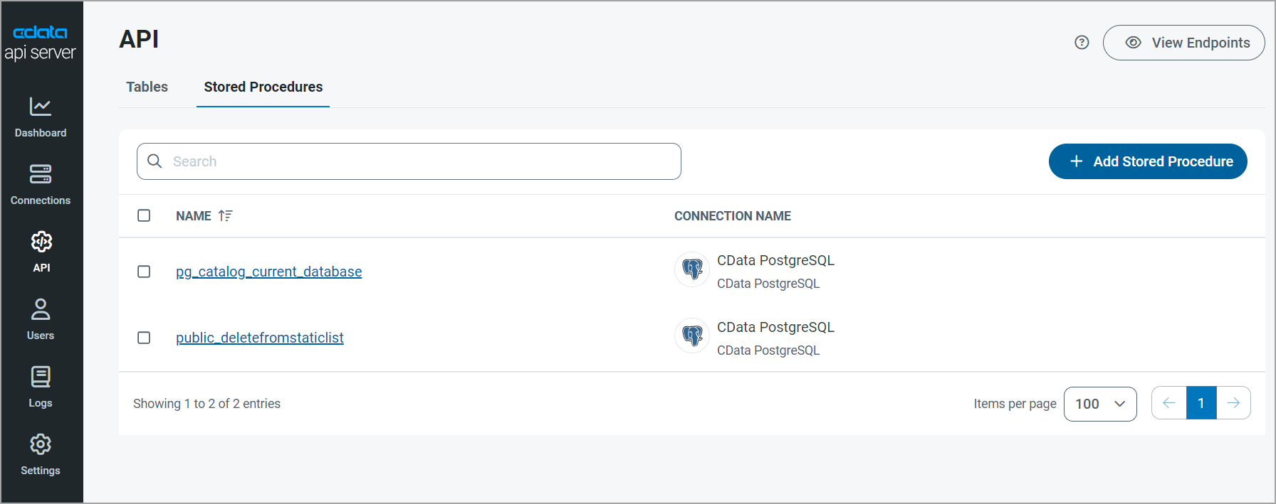 Click Confirm. The surfaced stored procedures appear on the Stored Procedures tab. You can now access this stored procedure in the tool of your choice, such as Postman.