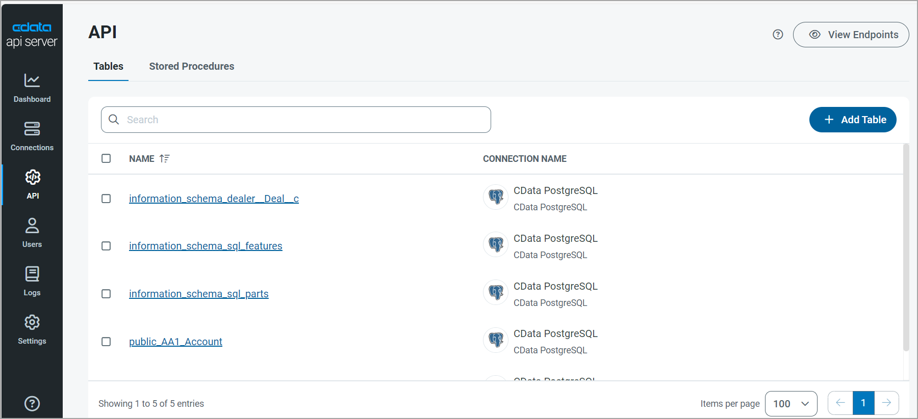 The API page of API Server contains the resources (tables and stored procedures) you surfaced from your data store and want to query.