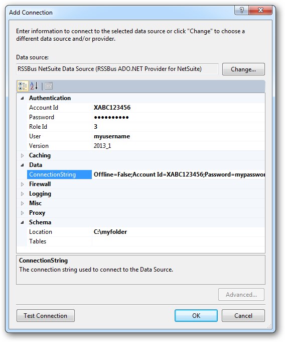 Connecting to a data source from Server Explorer is straightforward: Right-click the Data Connections node and click Add Connection. In the Choose Data Source window, select the RSSBus ADO.NET Provider for NetSuite.