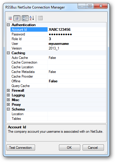 The User and Password properties, under the Authentication section, must be set to valid NetSuite user credentials. In addition, the AccountId must be set to the Id of a company account that can be used by the specified User. The RoleId can be optionally specified to log in the user, with limited permissions.