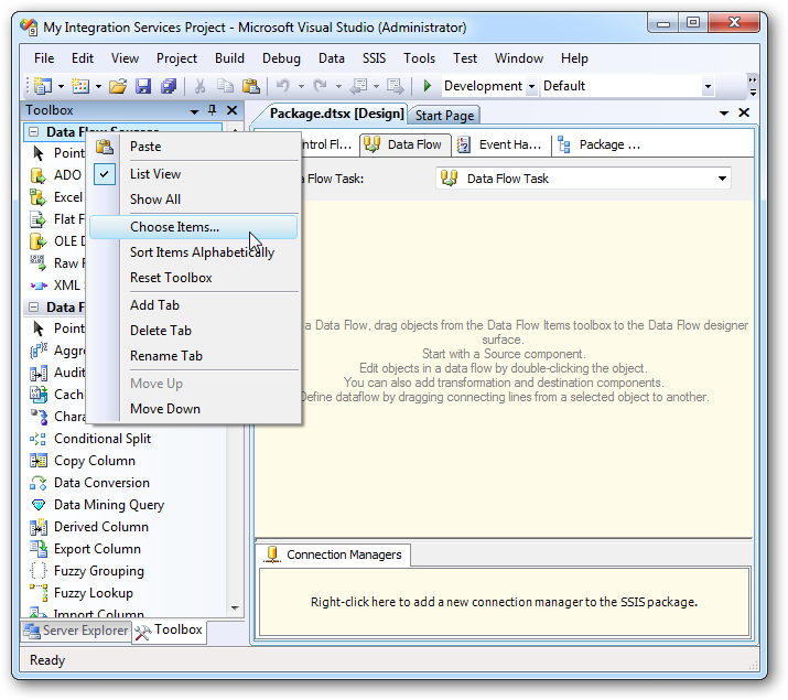 In Visual Studios 2005 and 2008, you will need to add the RSSBus NetSuite Source and RSSBus NetSuite Destination to the Toolbox. In Visual Studio 2012, they will be automatically available. To add the Source and Destination, right-click anywhere in the Toolbox and select Choose Items.
