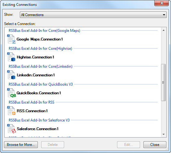 You can launch the Existing Connections dialog to manage existing connections. The dialog allows you to edit and delete existing connections.