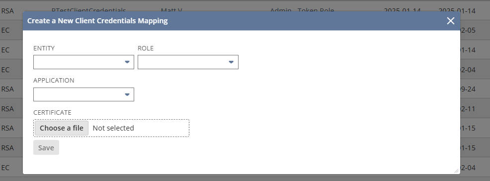 - Click the blue Create New button. This opens the Create a New Client Credentials Mapping window.