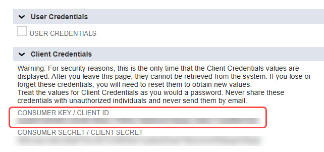 - Note: The consumer key and client secret only display once, immediately after creating the integration. If you return to this page, these values are no longer displayed.