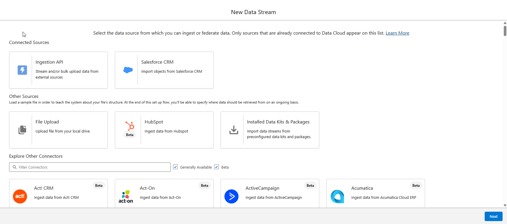 Salesforce Data Cloud allows you to use Ingestion API Connectors to create data streams for data sources that the Salesforce Data Cloud platform does not natively support.