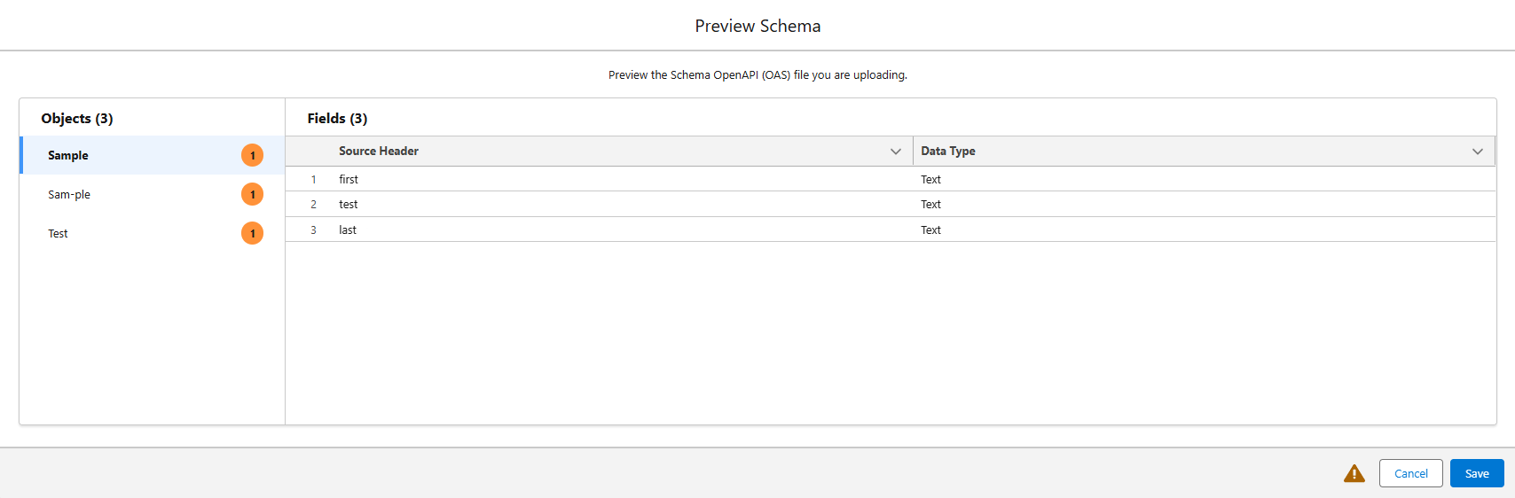 - In the upload files prompt, select an OpenAPI (OAS) formatted schema file (.yaml format) and click Open. The Preview Schema window opens.