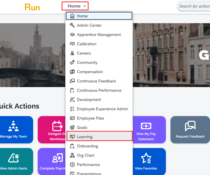 - Log in to SAP Successfactors. Open the page selection menu at the top of the page, to the left of the search bar (this should say "Home" if you logged into the homepage). Click Learning.